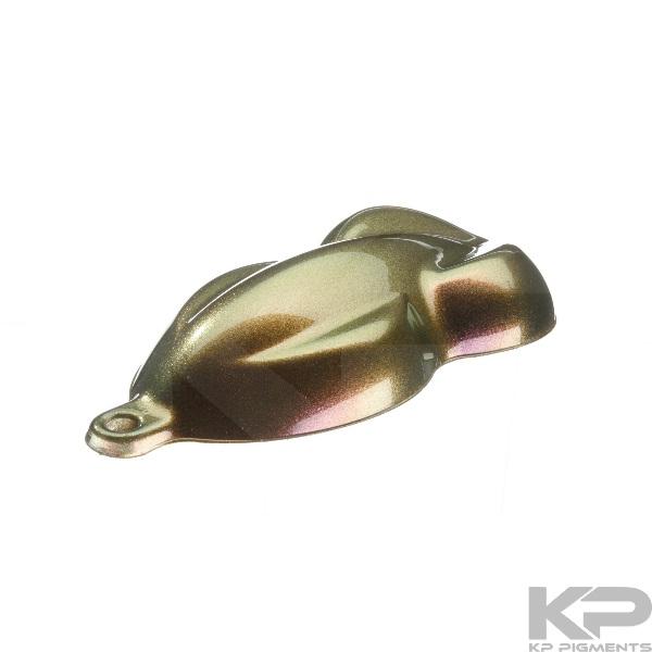 An Optically Variable (ColorShift/Color Changing) pearl pigment that travels from red to Purple to Orange to Gold. An intensely metallic colorshift pigment with tons of sprakle and highly chromatic highlights and down-flops. Pictured over a black base coat. Use .25 – 3% Ratio of KP Pigment to Clear.