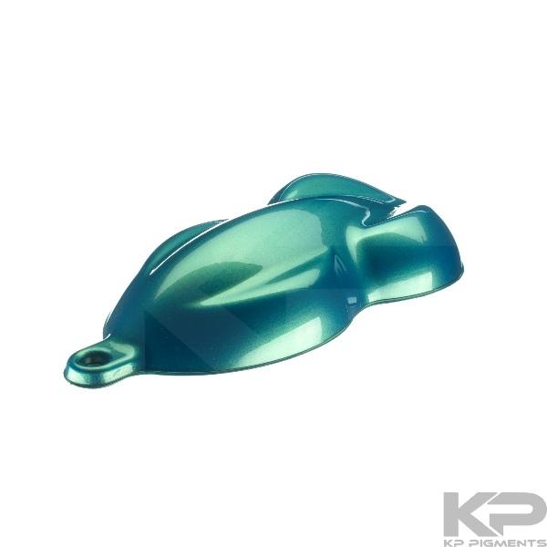 An Optically Variable (ColorShift/Color Changing) pearlescent pigment that shifts subtly between blue and gold hues and finishes to a fine pearl sheen. Pictured over a black base coat. Use .25 – 3% Ratio of KP Pigment to Clear.
