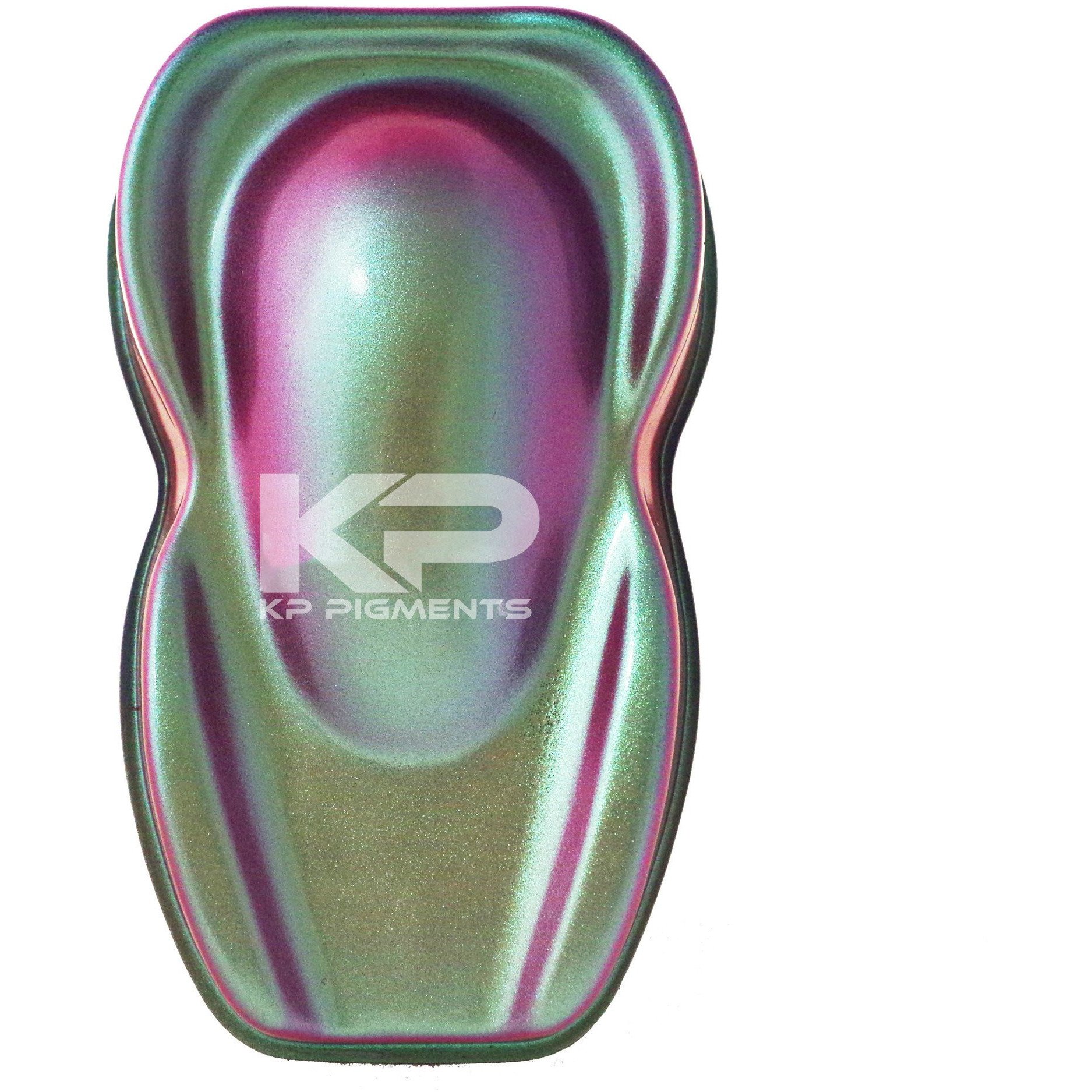 A strongly metallic and chromatic Optically Variable (ColorShift/Color Changing) pearl pigment that shifts between a wide spectrum of Greens, Blues, Purples and Pinks. Finishes with a good degree of sparkle and sheen. Pictured over a black base coat. Use .25 – 3% Ratio of KP Pigment to Clear.
