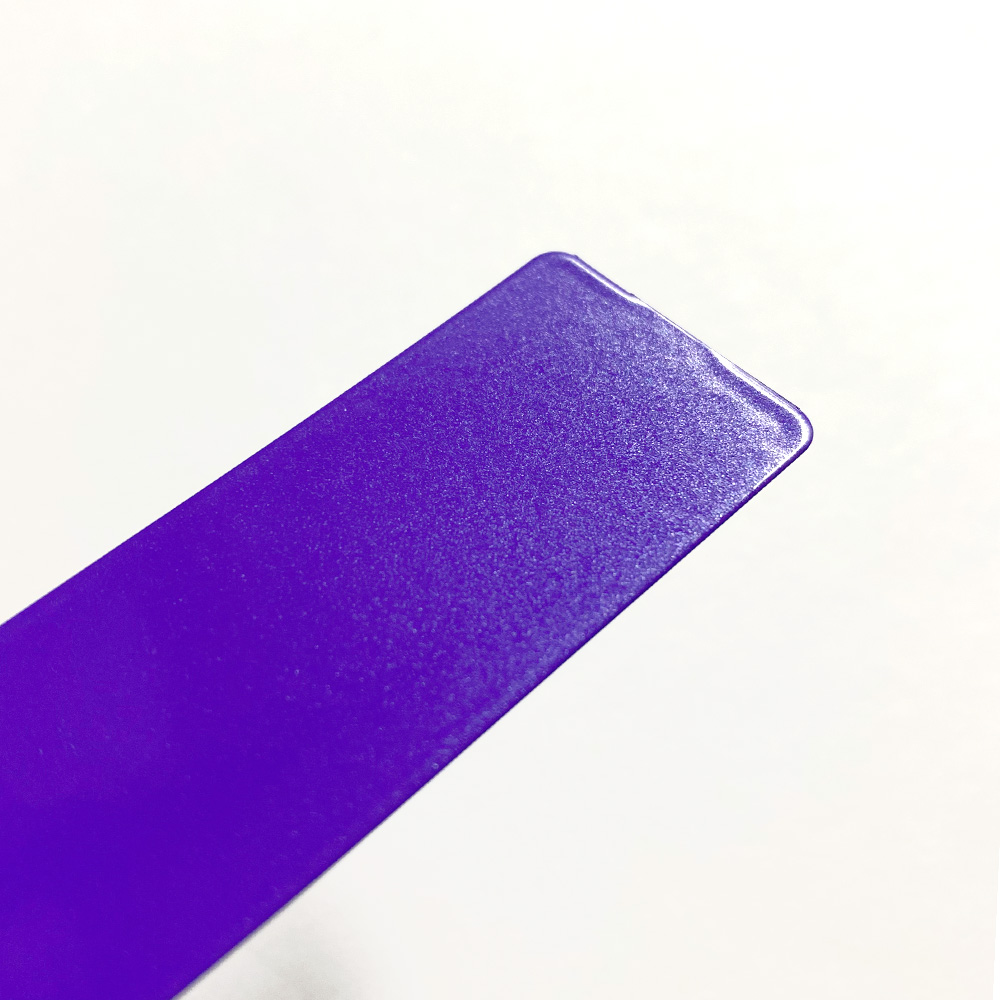 A high gloss purple coating with a smooth finish and contains a fine violet metallic flake (pearl-like).