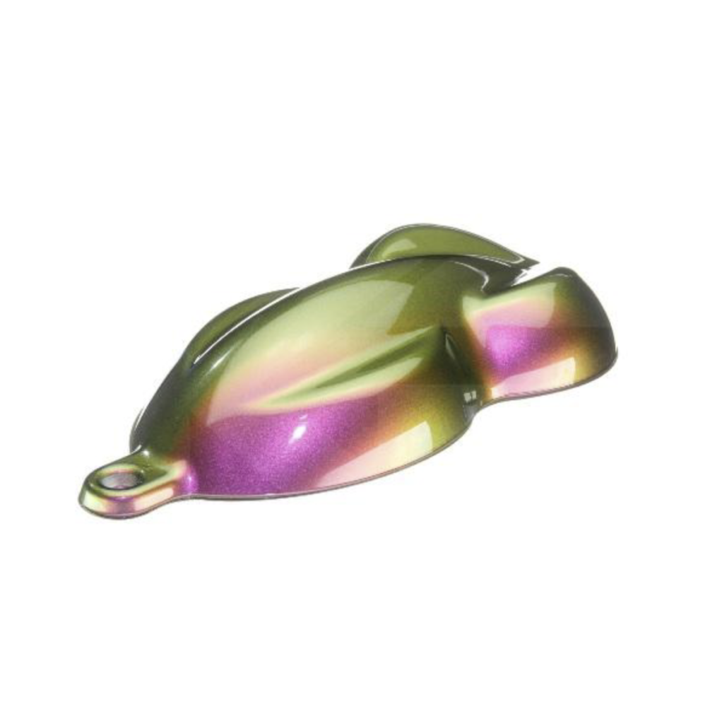 The most vivid and chromatic colorshift/ color travel pigments on the market. Unbelievable hiding ability and chroma; shifts between: Rose Red to Golds to Yellows to Greens to Blues. Finishes to a super fine pearlescent sheen. Pictured over a black base coat. Use .25 – 3% Ratio of KP Pigment to Clear.