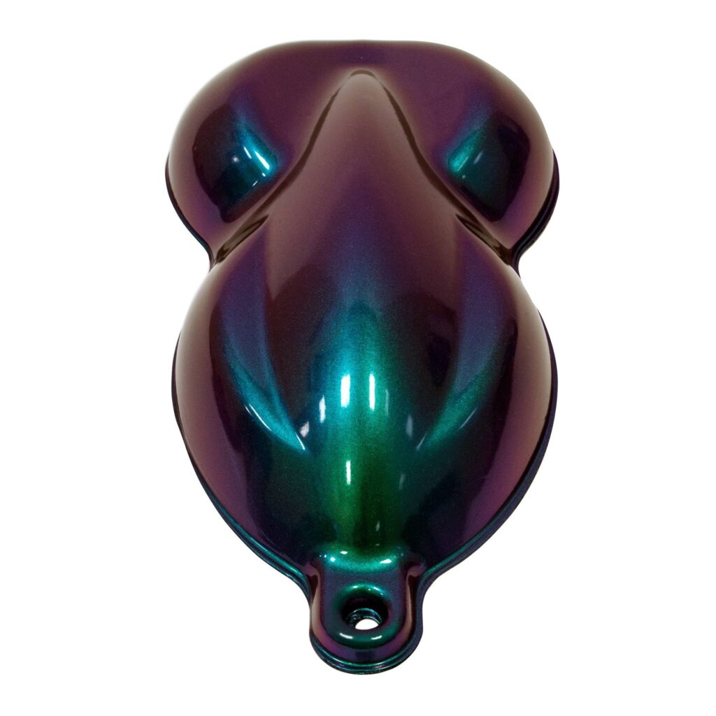 The most vivid and chromatic colorshift/ color travel pigments on the market. Unbelievable hiding ability and chroma; shifts between: Teals to Greens to Blues to Purples. Finishes to a super fine pearlescent sheen. Pictured over a black base coat. Use .25 – 3% Ratio of KP Pigment to Clear.