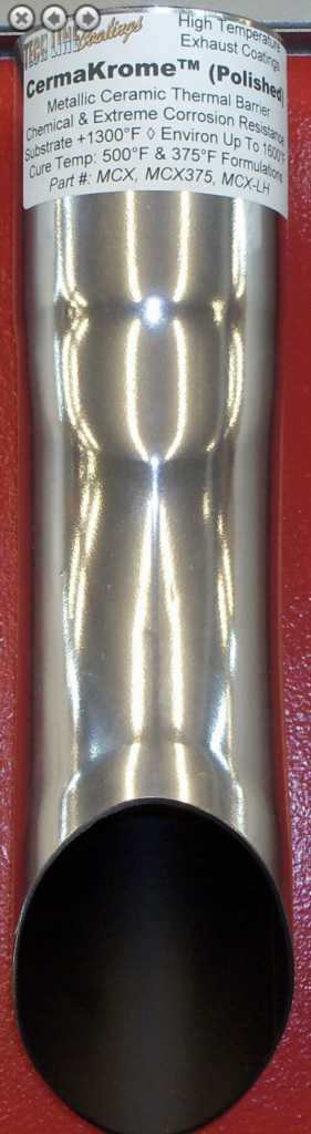 CermaKrome (MCX) is a metallic ceramic coating capable of providing extremely high levels of corrosion and chemical protection in a very thin film while producing a very high luster, near chrome appearance. When applied to exhaust systems, MCX will withstand substrate temperatures of over 1300�F and environmental temperatures of up to 1600�F (higher temperatures with a base coat or double coating). In addition, the direct flame will not cause delamination as long as substrate temperatures do not exceed this temperature. Due to its unique ceramic nature, the coating also functions as a very effective thermal barrier, with reduced thermal radiation characteristics. Requires a 500�F cure, with maximum hardness achieved with a 650�F cure. After curing, the coating requires �burnishing� to be sealed. This burnishing process can produce a very high luster, near chrome, appearance. MCX cures out to a very hard surface with excellent adhesion. The water-based solvent system provides for an environmentally friendly material with a bake/cure cycle that is not as hazardous as other thermally cured resin systems.