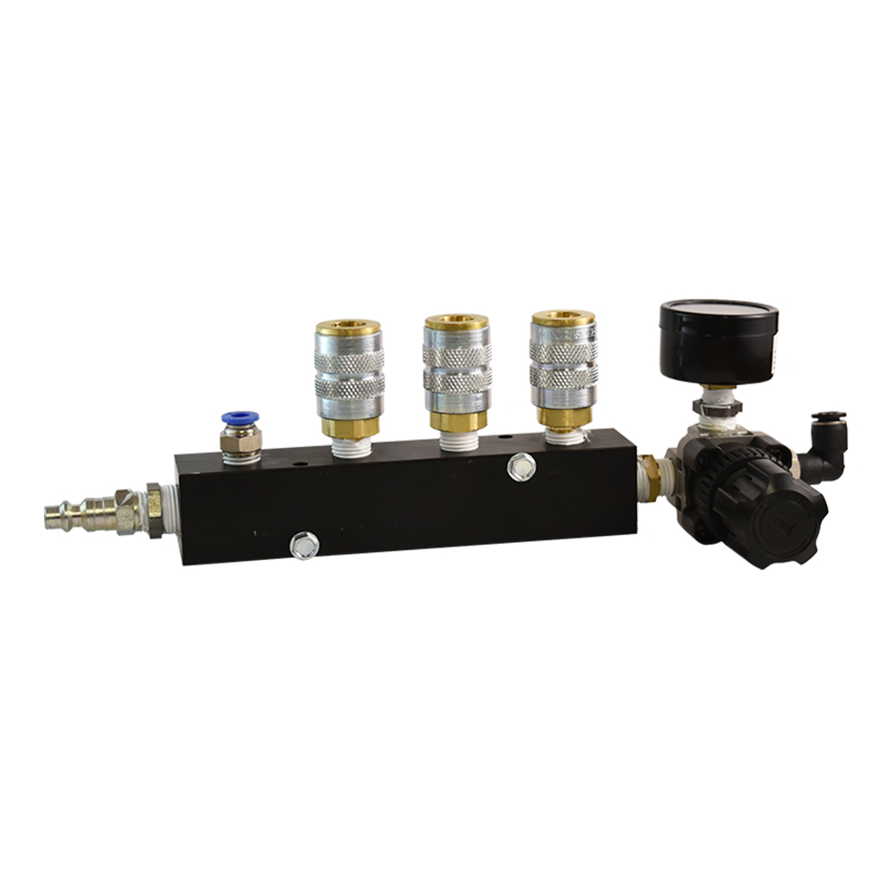 The Air Manifold booth attachment can be mounted to your powder booth or any other sheet metal surface (mounting screws included). One air hose in now amounts to a total of five air ports, one of which has a regulator for fluidizing kegs or vibration stands. The input for the Air Manifold can accept the standard ¼” quick connect, ¼” NPT, or ⅜” NPT.