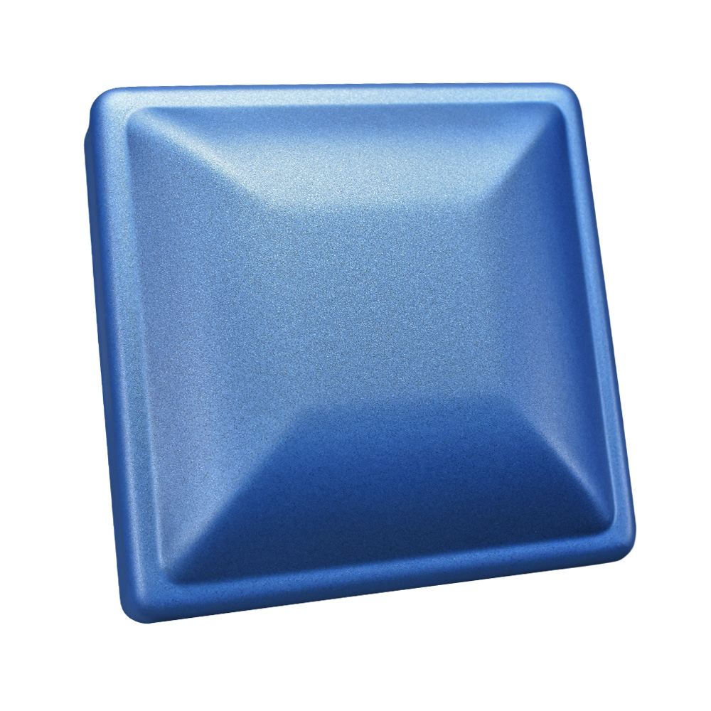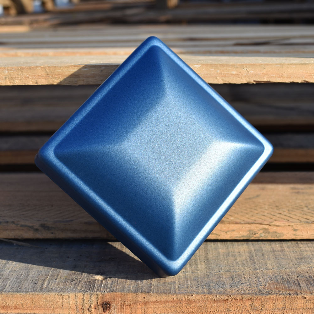 A cool, deep blue coating with very fine metallic flakes and a smooth finish.