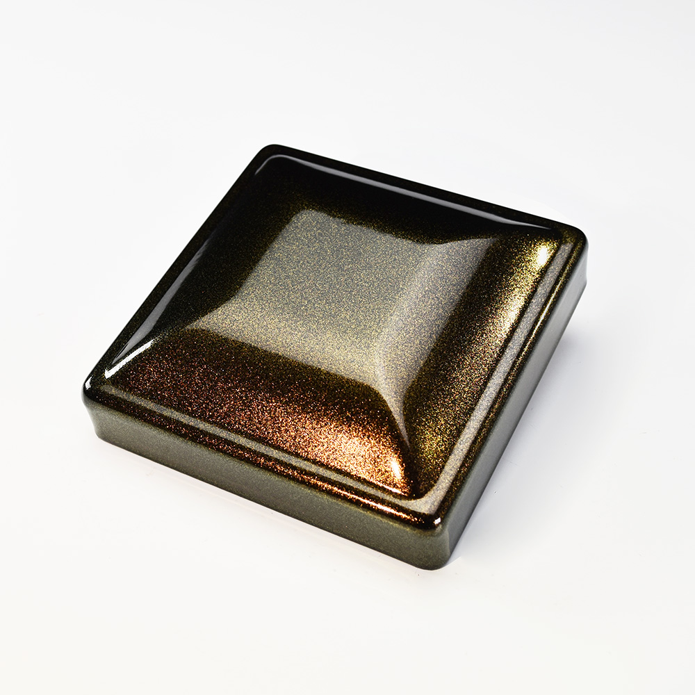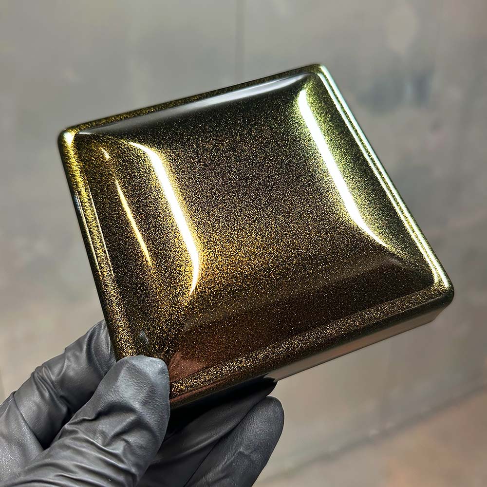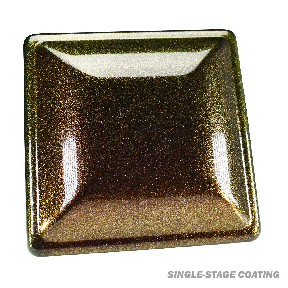 This is a smooth, high gloss coating with a heavy amount of vibrant, color-shifting metallic flakes. These intense color shifting flakes change colors between bronze, copper, gold, and sage green. Pictures and videos don’t do this color justice, so order a swatch to see this coating in person.