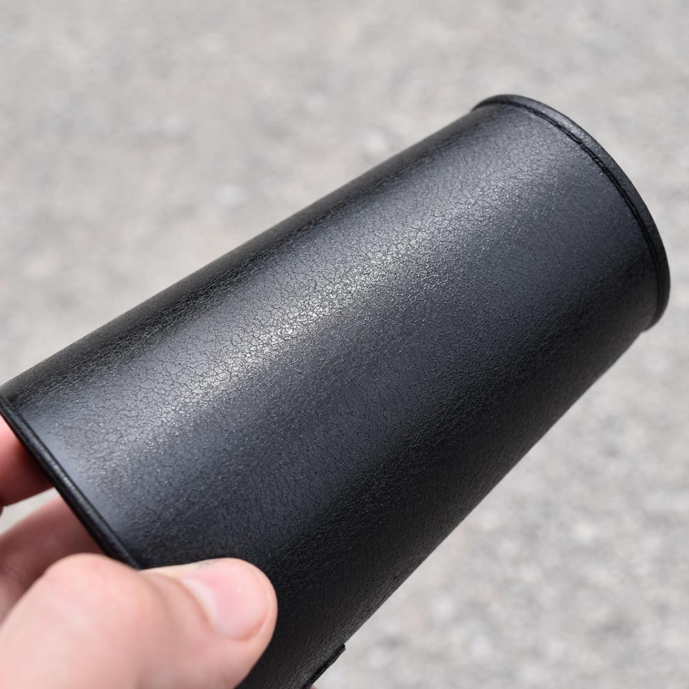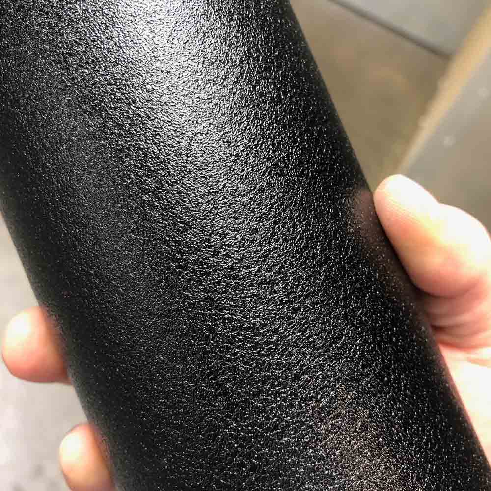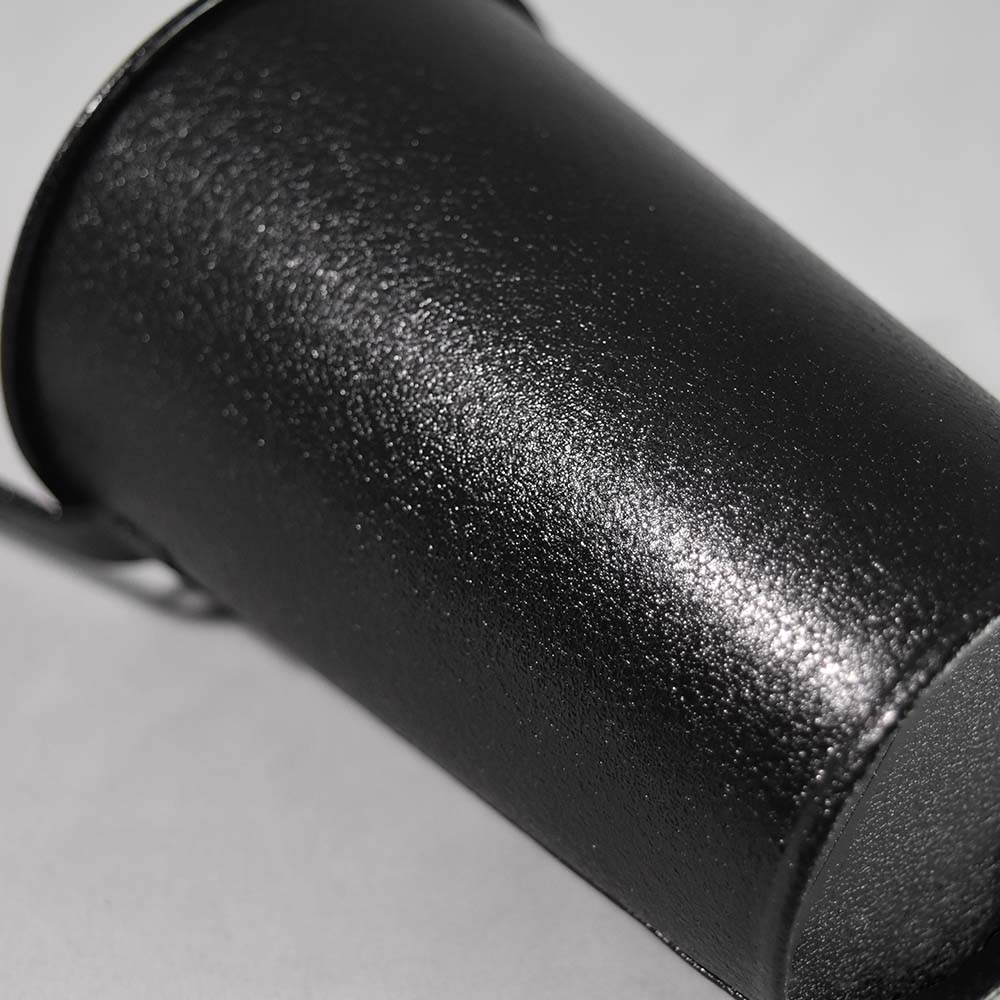A high-gloss, black coating with a leather-like, wrinkle finish.