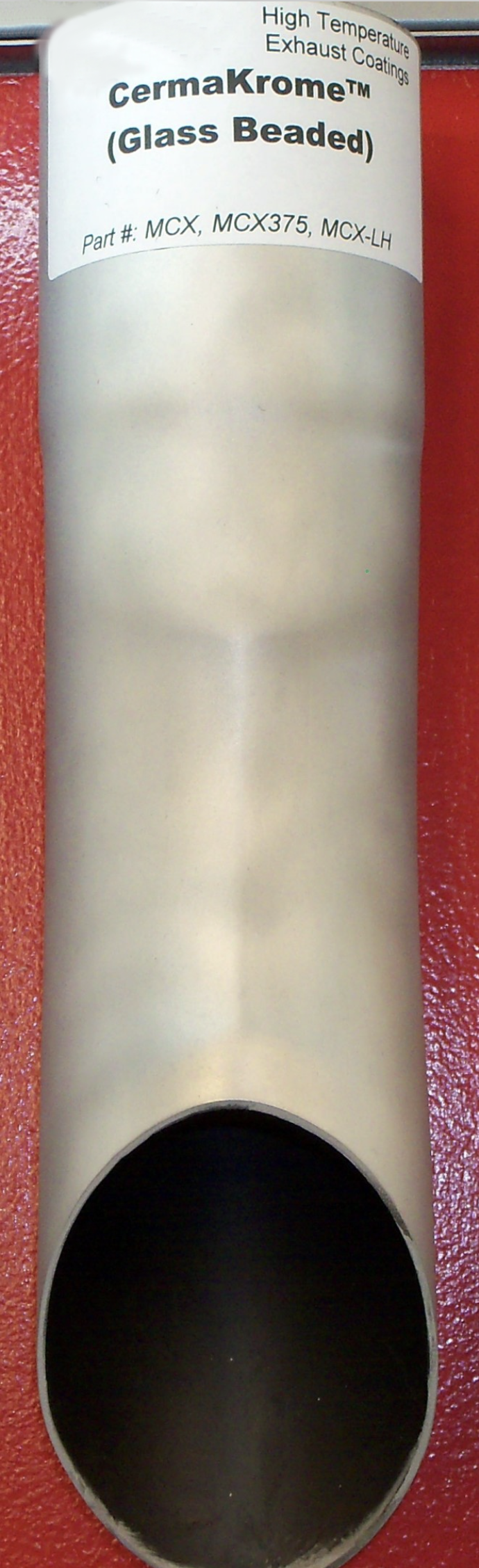 CermaKrome (MCX) is a metallic ceramic coating capable of providing extremely high levels of corrosion and chemical protection in a very thin film while producing a very high luster, near chrome appearance. When applied to exhaust systems, MCX will withstand substrate temperatures of over 1300�F and environmental temperatures of up to 1600�F (higher temperatures with a base coat or double coating). In addition, the direct flame will not cause delamination as long as substrate temperatures do not exceed this temperature. Due to its unique ceramic nature, the coating also functions as a very effective thermal barrier, with reduced thermal radiation characteristics. Requires a 500�F cure, with maximum hardness achieved with a 650�F cure. After curing, the coating requires �burnishing� to be sealed. This burnishing process can produce a very high luster, near chrome, appearance. MCX cures out to a very hard surface with excellent adhesion. The water-based solvent system provides for an environmentally friendly material with a bake/cure cycle that is not as hazardous as other thermally cured resin systems.