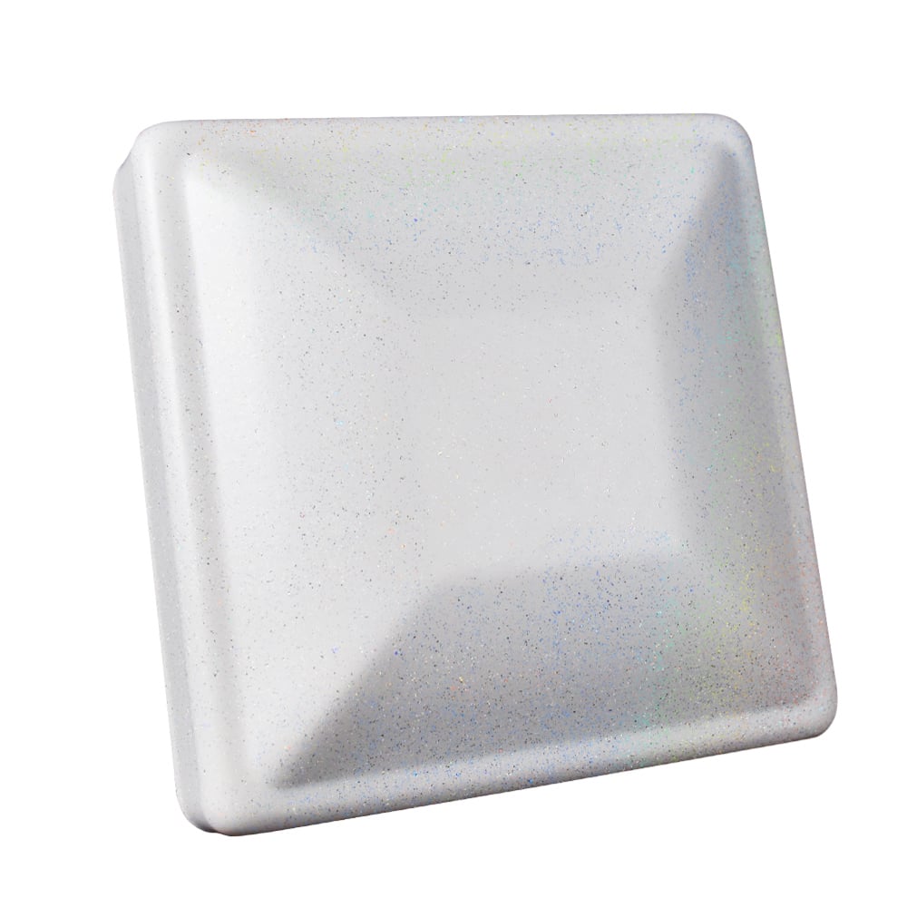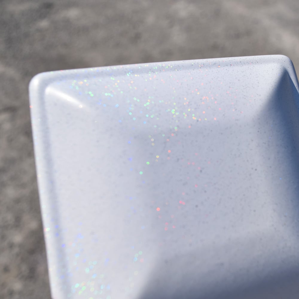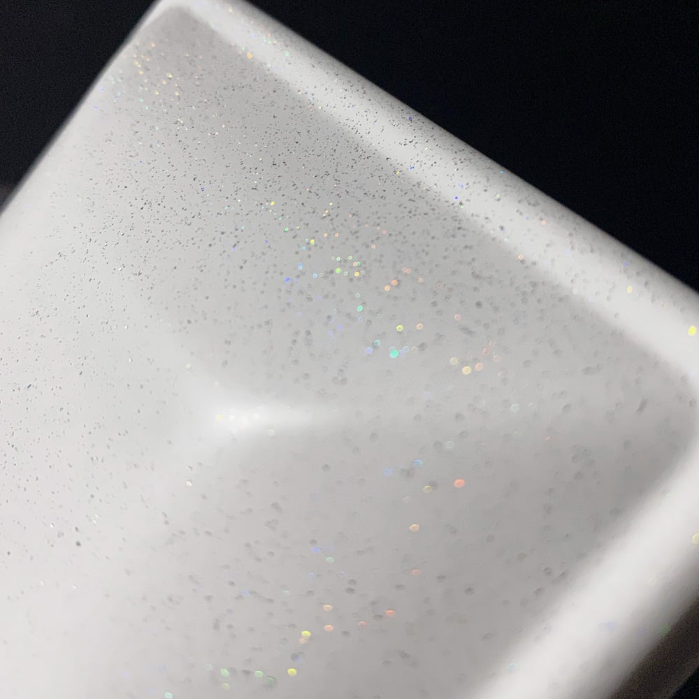 This is a bright white coating with intense rainbow color shifting metallic flakes and a matte finish. This rainbow effect is most vibrant in the sunlight, but it also pops in low-light environments. Photos do not do this color justice, so be sure to order a swatch to see for yourself!