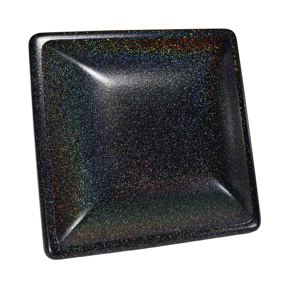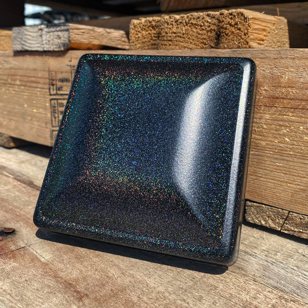 This is a deep black coating with intense rainbow color shifting pearl flakes and a very low gloss finish. This rainbow effect is most vibrant in the sunlight, but it also pops in low-light environments.