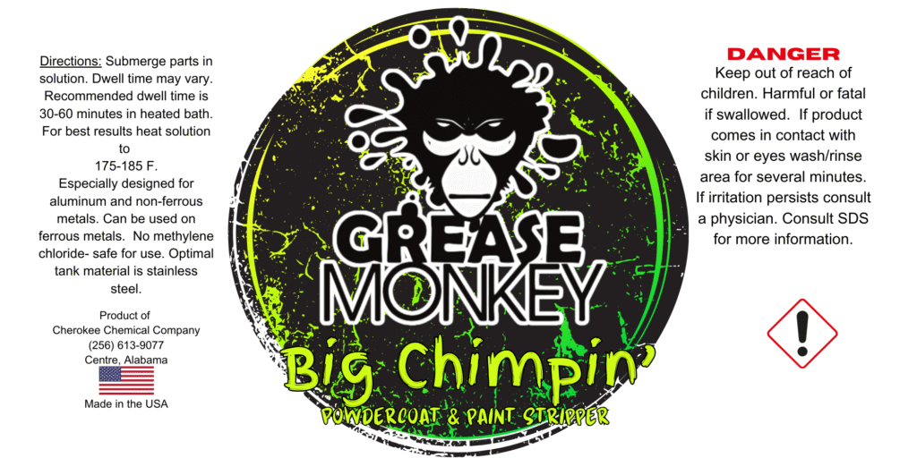 Revitalize metal parts quickly and safely with Grease Monkey™ Big Chimpin’, a powerful, methylene‐chloride‐free stripper formulated to remove powder coating, paint, epoxy, and enamel. Specially engineered for aluminum and non‐ferrous metals (including magnesium), it also works effectively on ferrous substrates. Simply submerge parts in a heated stainless‐steel tank; recommended dwell time is 30–60 minutes at 175–185 °F for fastest, most thorough results. The no‐chlorinated formula minimizes fumes and environmental impact, making it ideal for professional shops and home‐based projects alike.