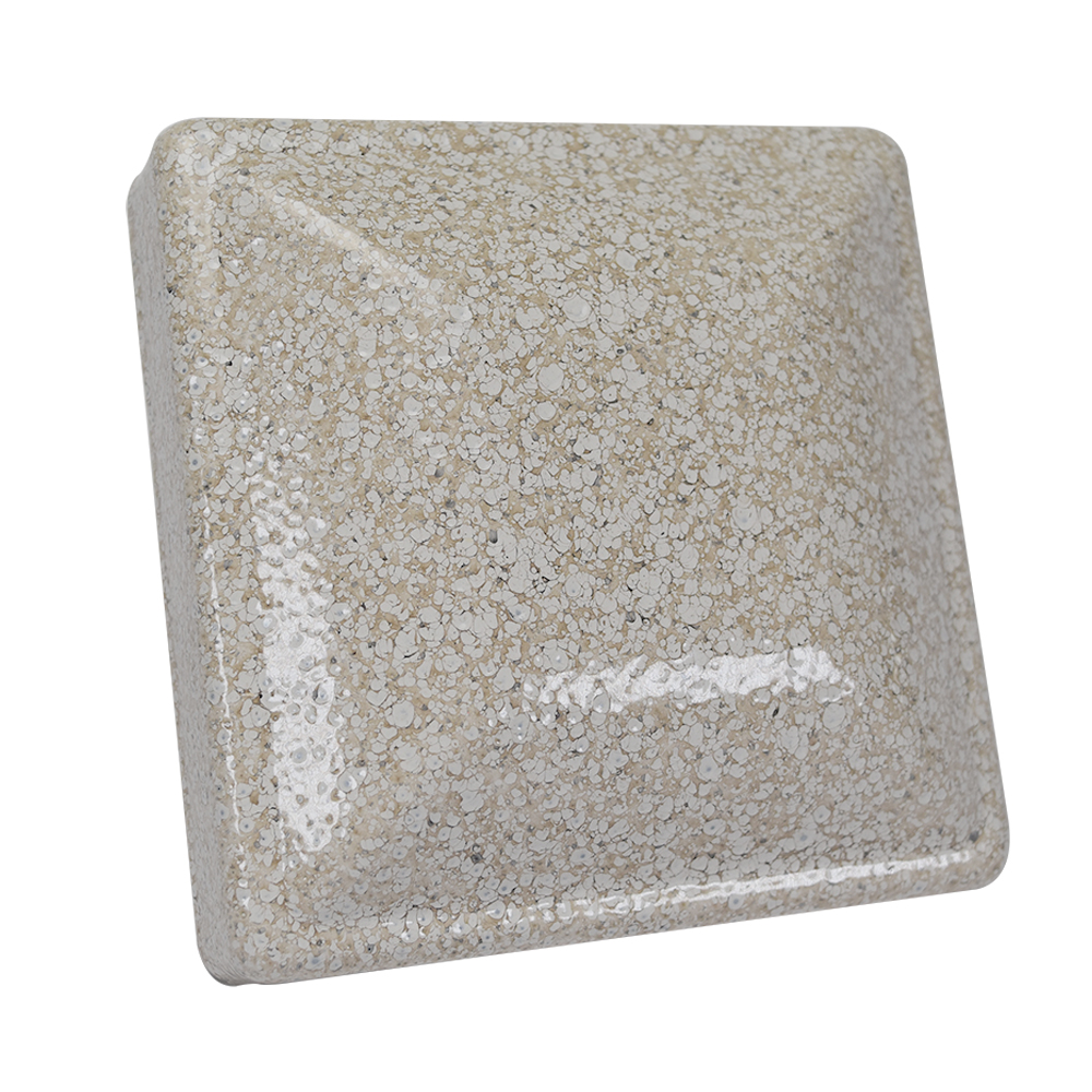 Gloss, cratered dirty sand granite. Durable for all conditions. It does not require a clear topcoat and is excellent for both interior and exterior conditions. Online image enlarged for detail.