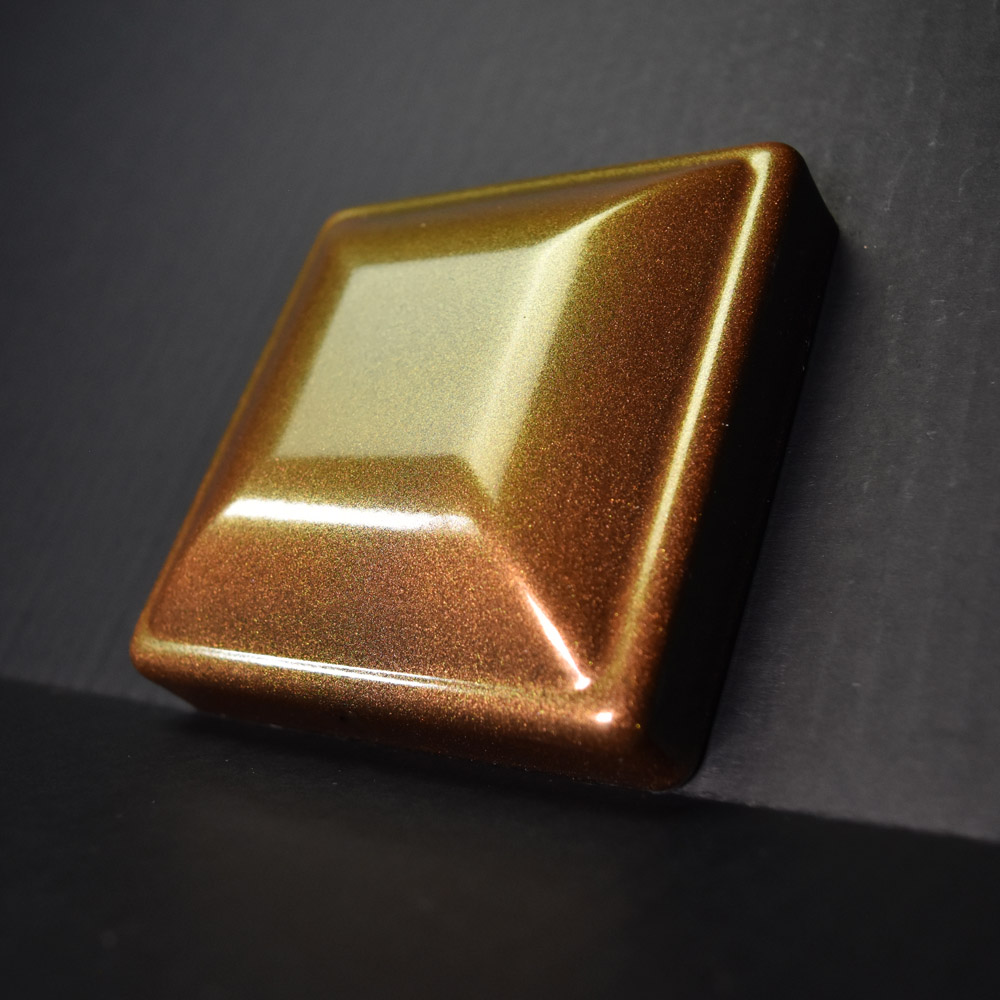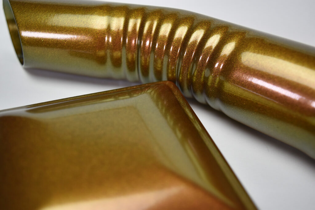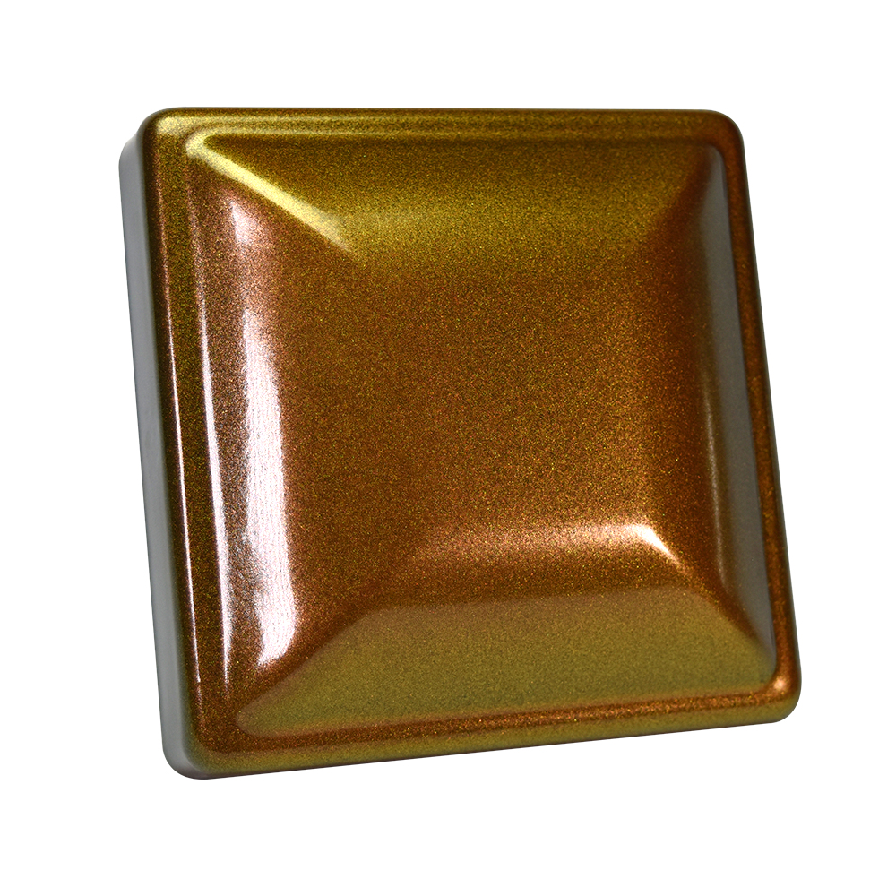 This is a high gloss clear coat with a heavy amount of color-shifting, metallic flakes. These vibrant flakes change between orange, gold, cyan, and green.