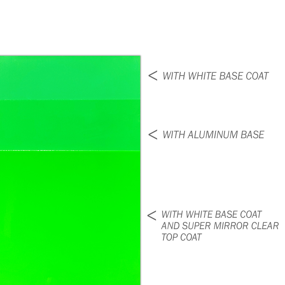 This fluorescent green offers excellent durability! No clear top coat needed if being kept indoors or in areas that do not receive high UV light! However, even though it has UV stability, we do recommend using our Super Mirror Clear top coat if being kept outside or in those areas that receive high UV light to keep the neon pigments from fading.