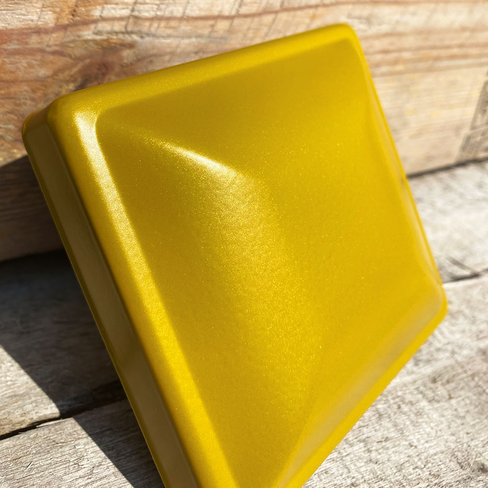 This is a bright gold coating with fine gold flakes. This product requires a clear top coat.