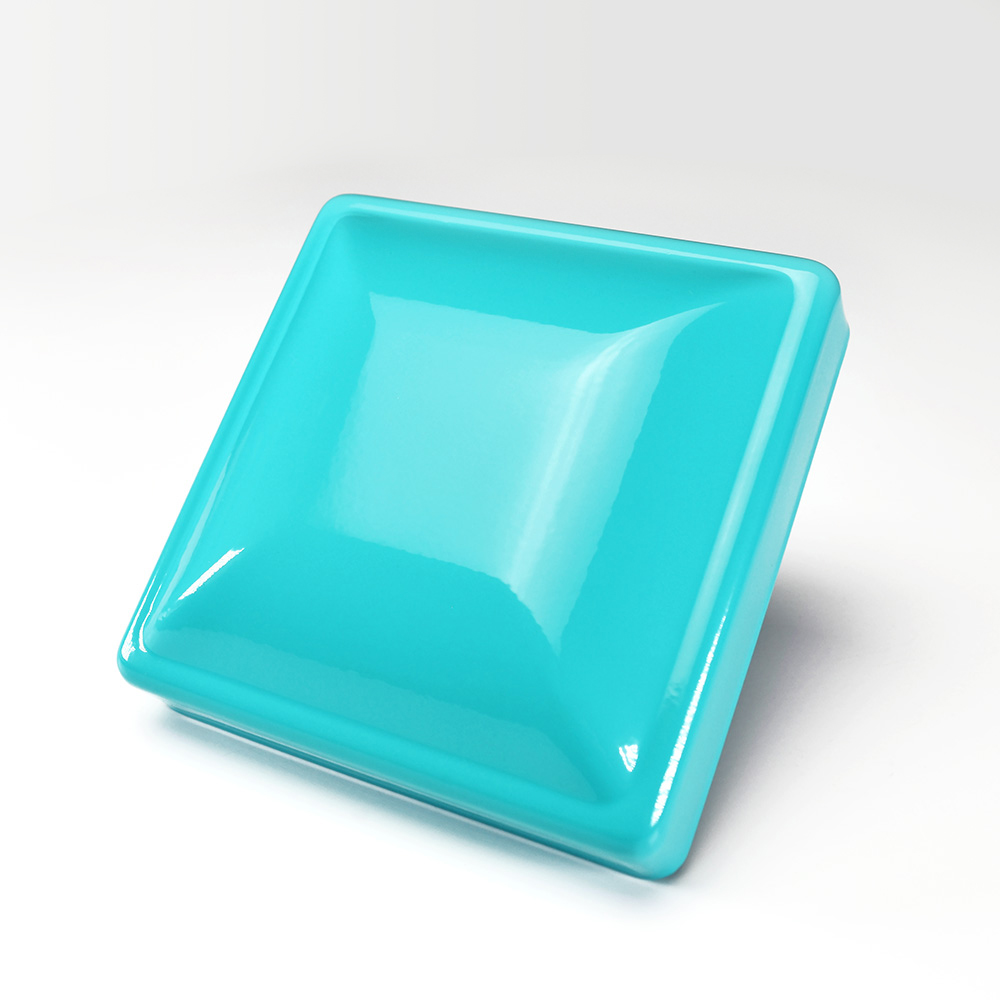 This is a beautiful, vibrant turquoise blue coating with a smooth, high-gloss finish.