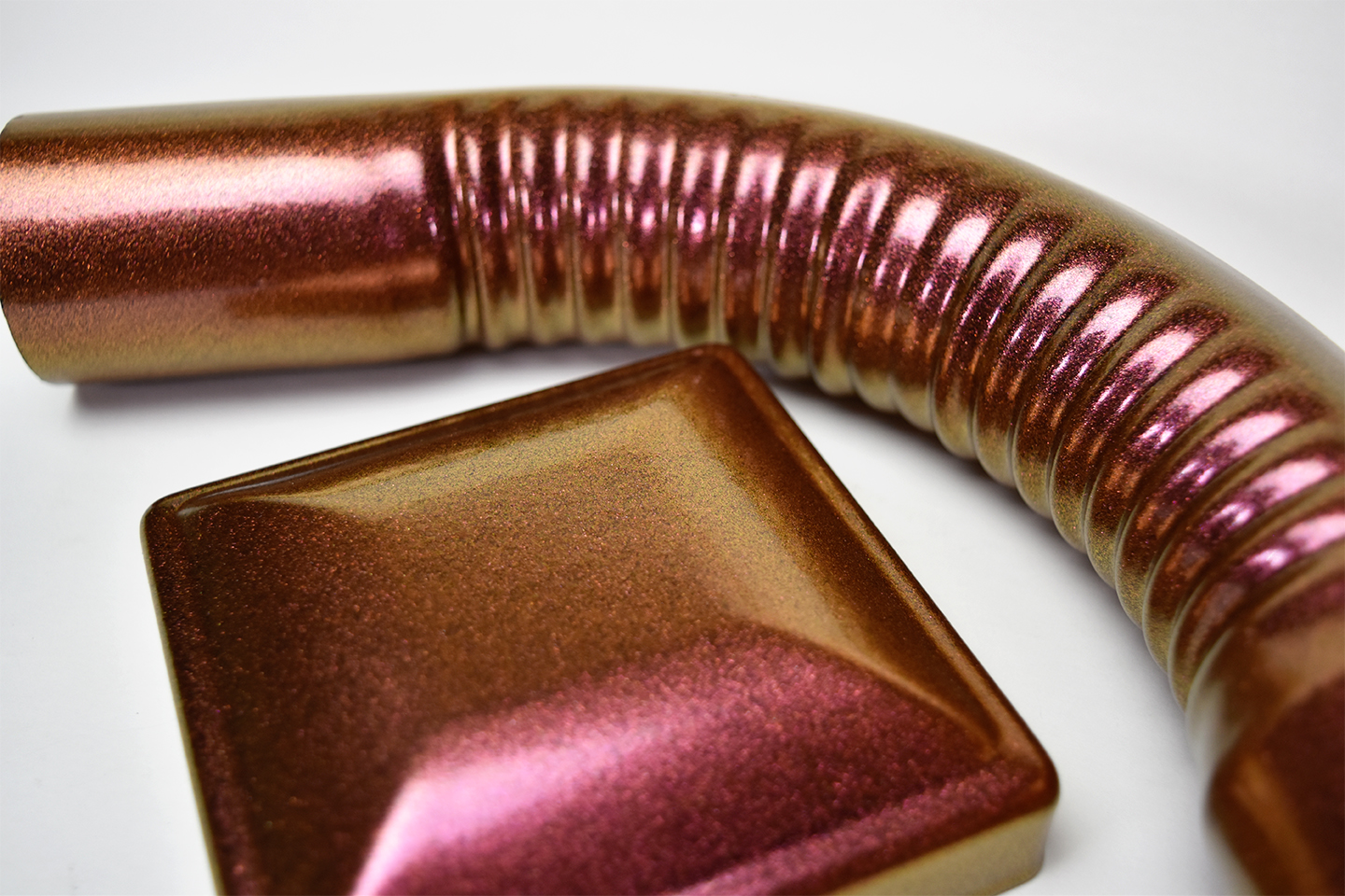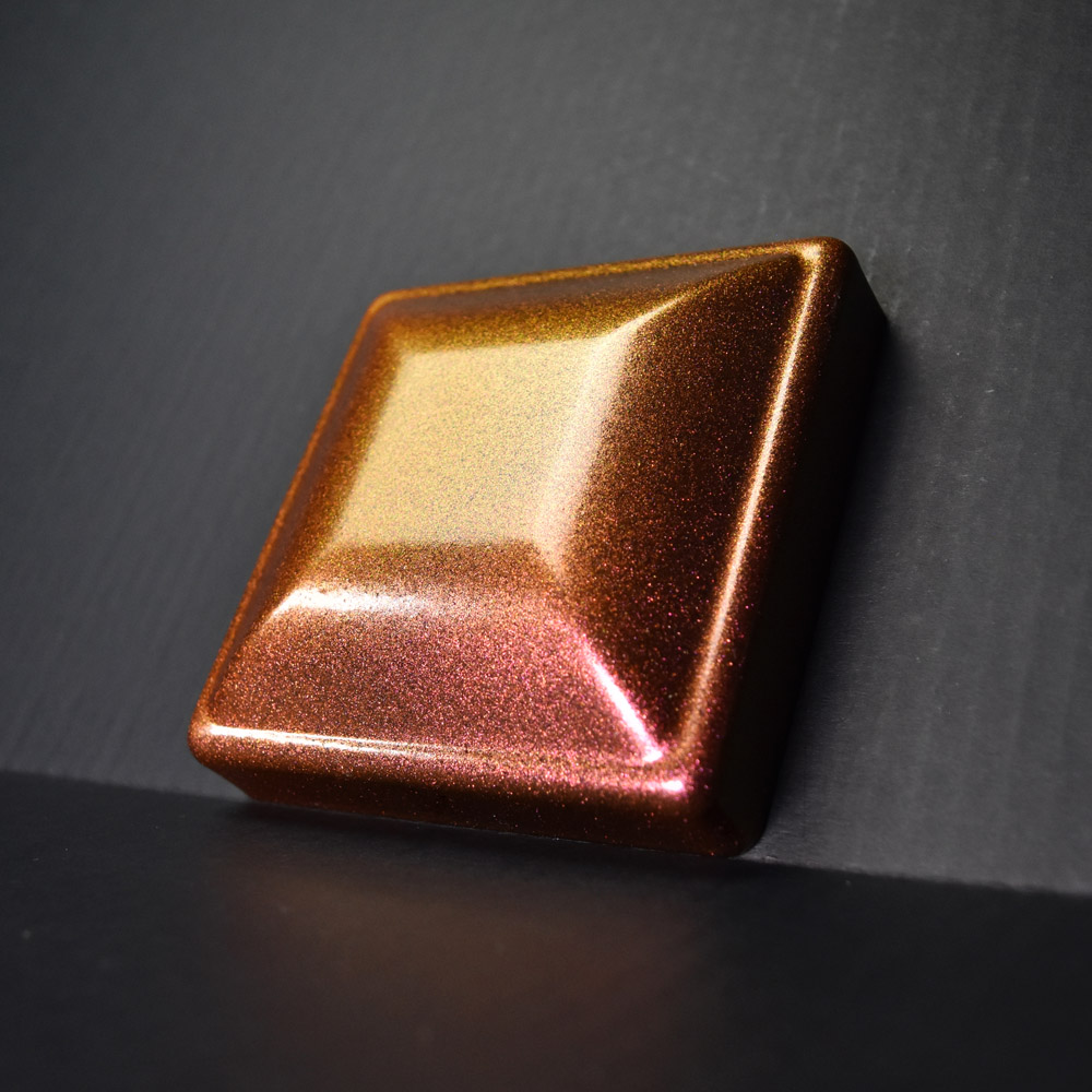 This is a high gloss clear coat with a heavy amount of color-shifting, metallic flakes. These vibrant flakes change between raspberry, red, orange, gold, yellow, and yellow-green.
