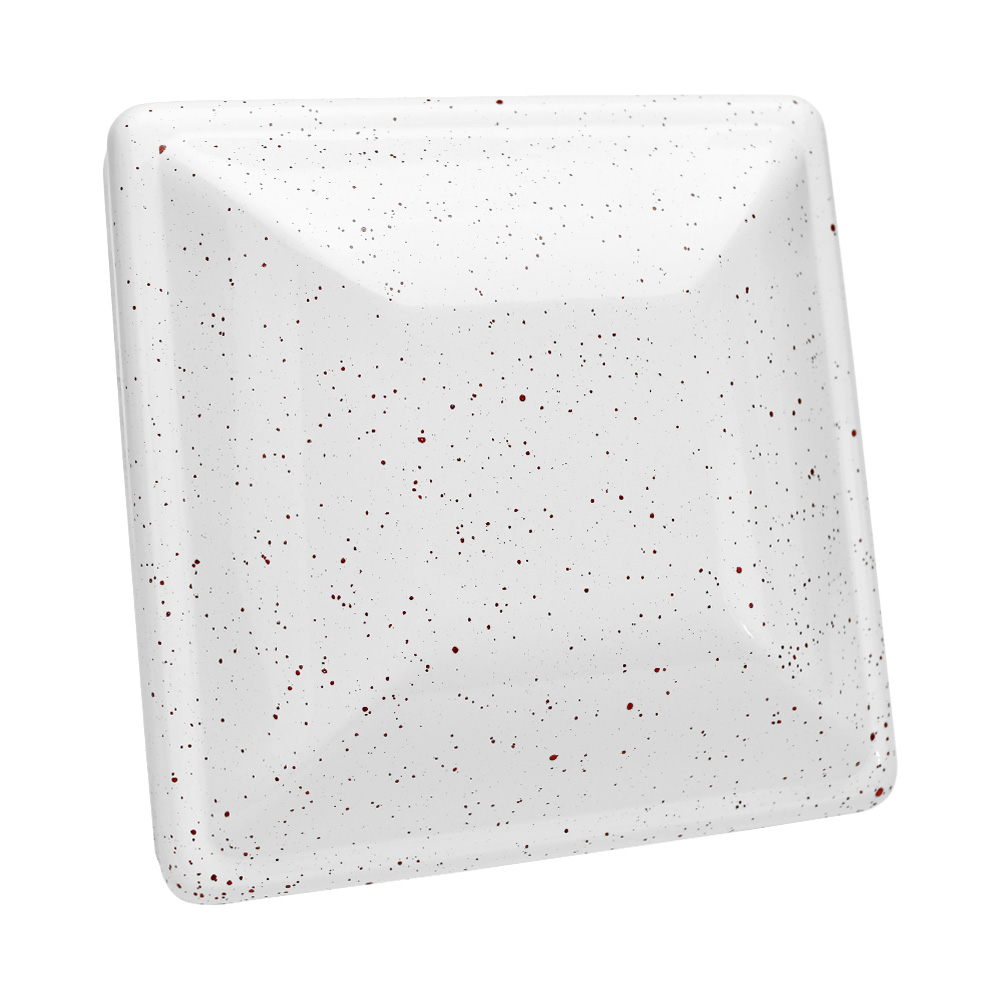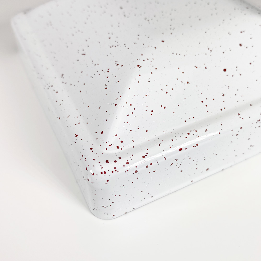 This is a unique, white semi-texture coating with dark red/maroon spots and a high gloss finish. These spots have a similar look to splatters of paint or blood.