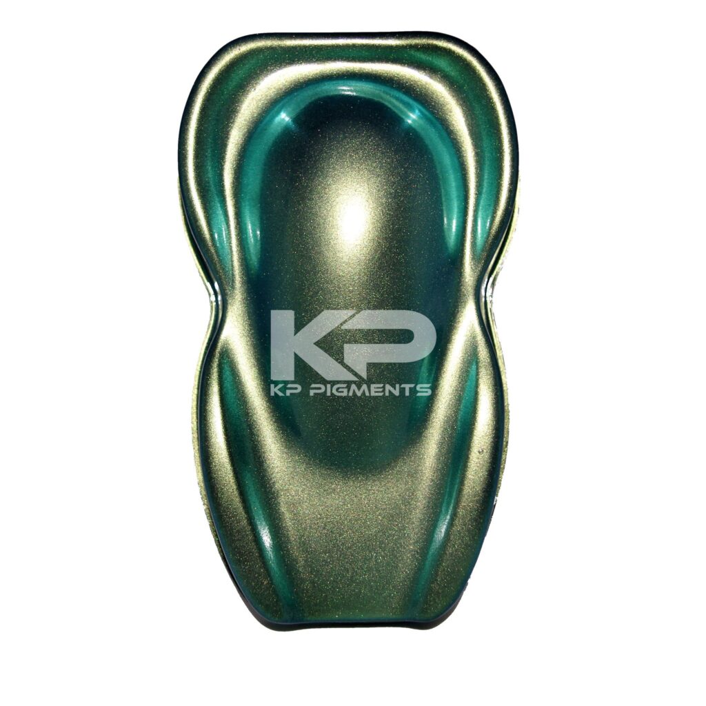 A fine Optically Variable (ColorShift/Color Changing) interference pearl pigment that shifts between Green, Blue, Purple and Gold and finishes to a fine pearl sheen. Pictured over a black base coat. Use .25 – 3% Ratio of KP Pigment to Clear.