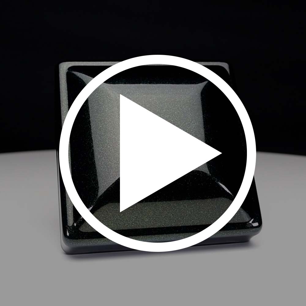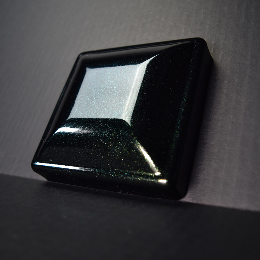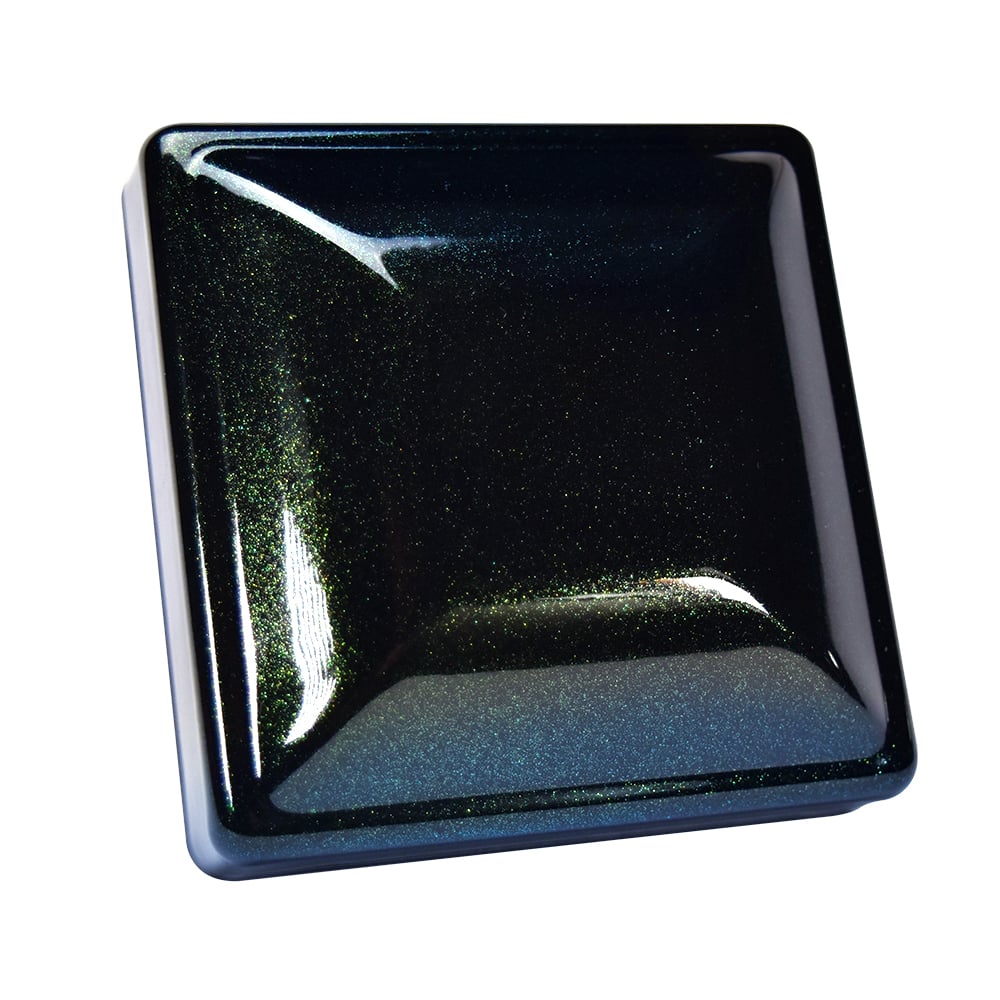 This is a high gloss black coating with a heavy amount of color-shifting, metallic flakes. These vibrant flakes change between gold, green, cyan, and blue.