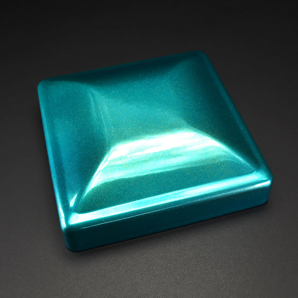 This is a high gloss, candy/translucent teal coating with a heavy amount of fine gold metallic pearl/flakes.