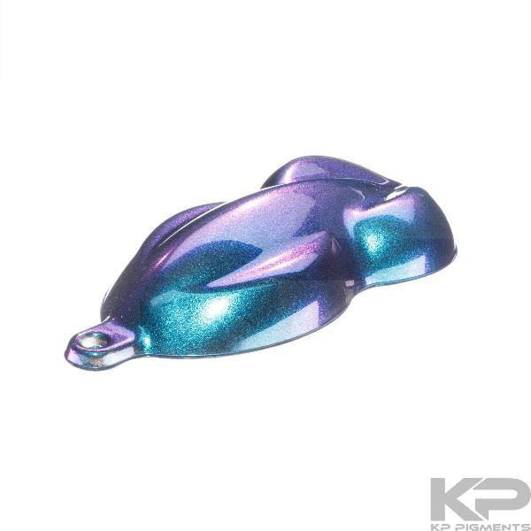 An Optically Variable (ColorShift/Color Changing)åÛÊ interference pearl pigment that shifts from Blue to Indigo, to Purple to Teal. An intense sparkle Interference ColorShift pigment with strong metallic effects and highly chromatic colors. Pictured over a black and white basecoat. Use .25 – 3% Ratio of KP Pigment to Clear.