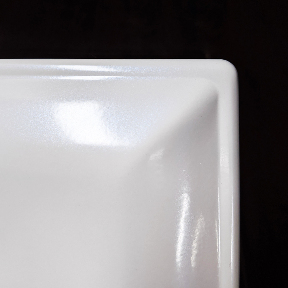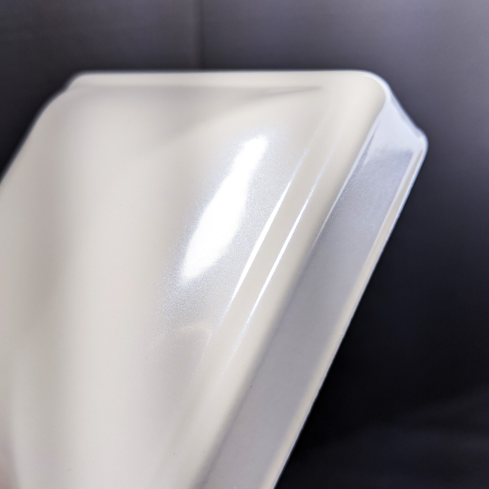 This is a smooth, high gloss white coating with extra-fine blue flakes that shine in the light.