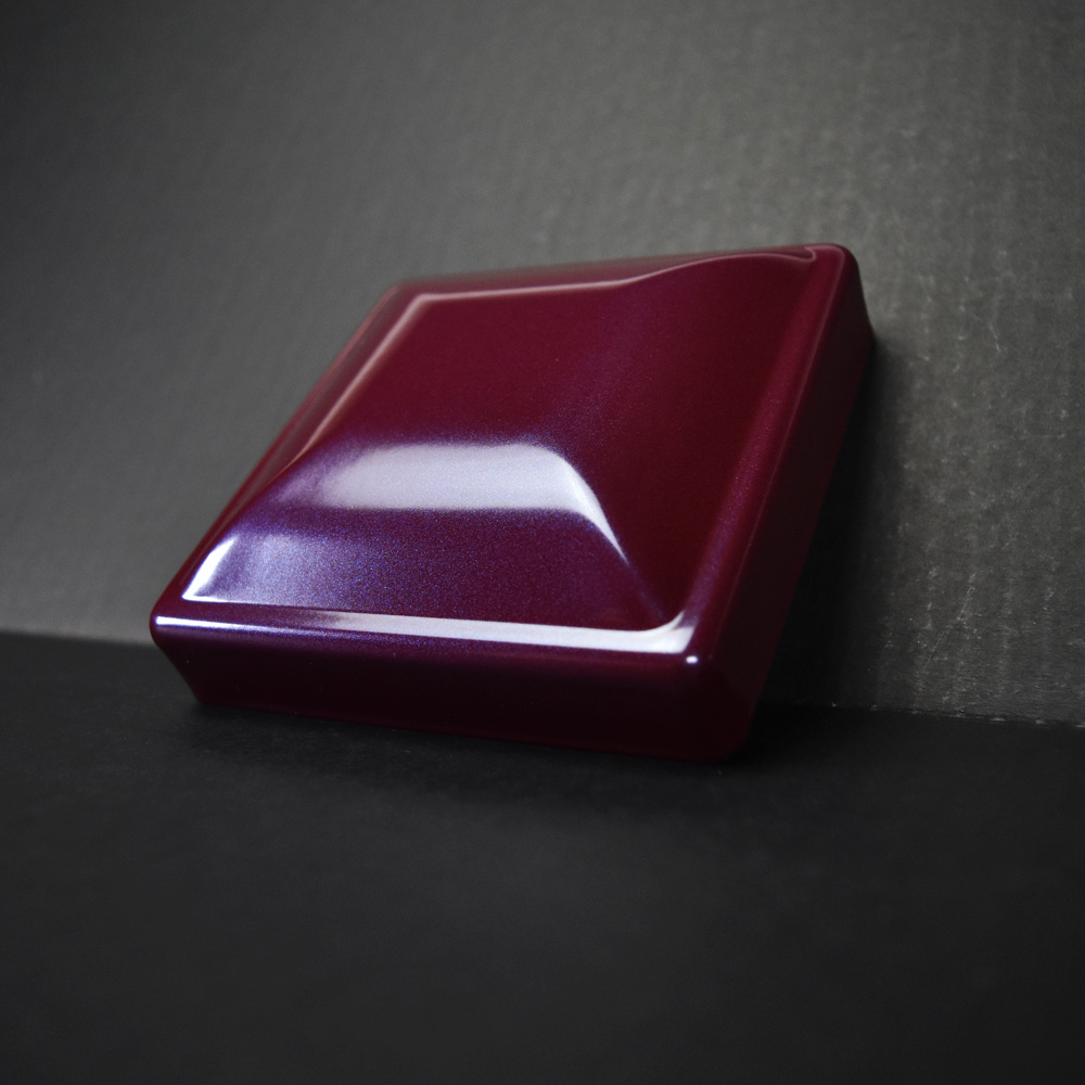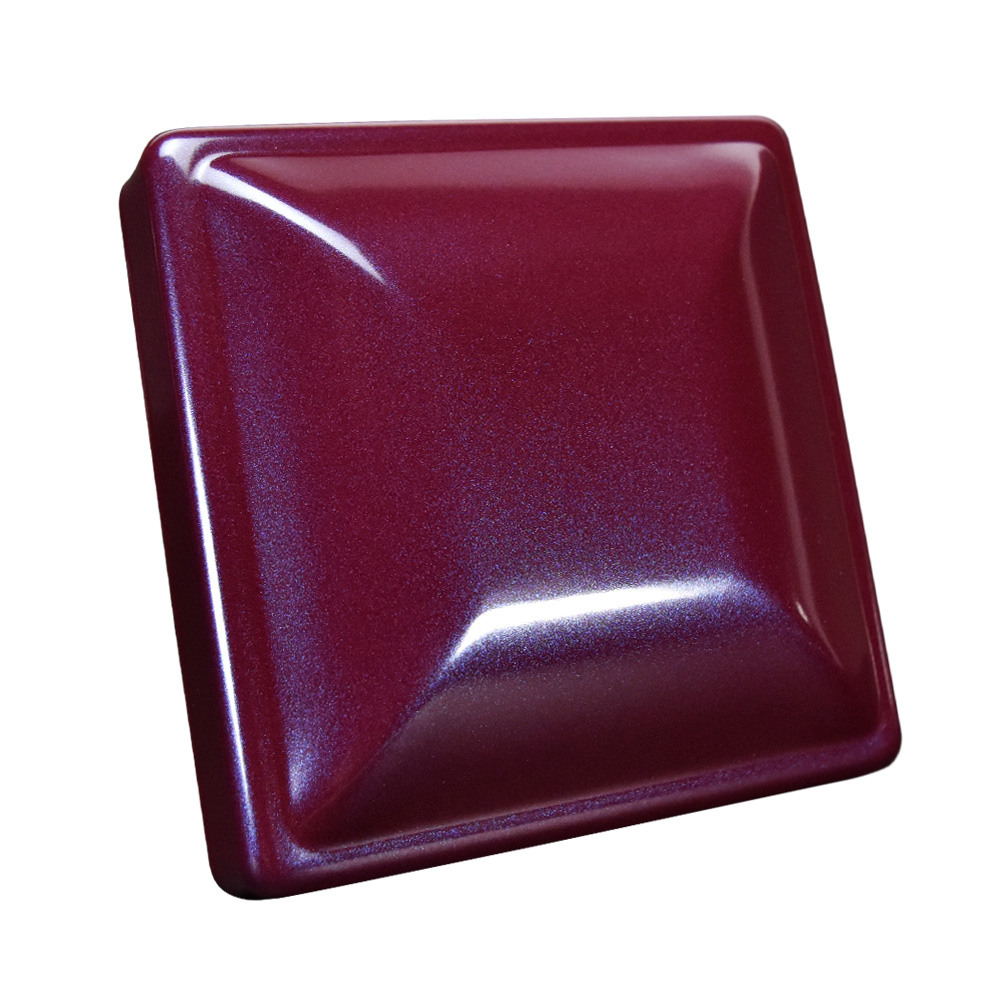 This is a high gloss, single stage, plum-red coating with fine, blue metallic flakes.