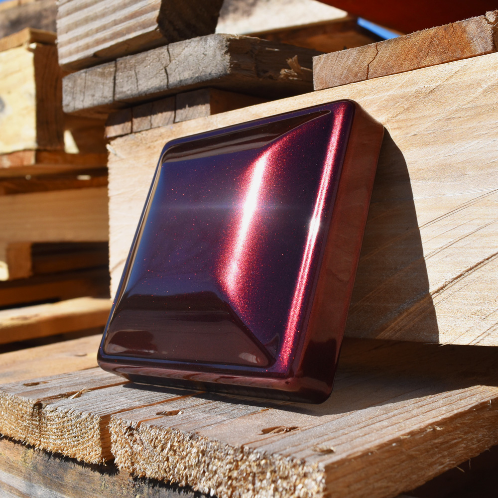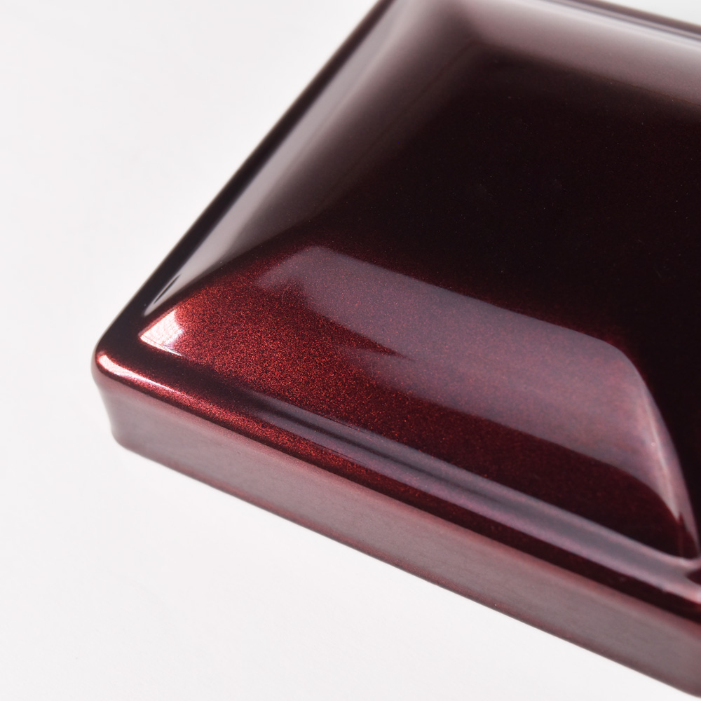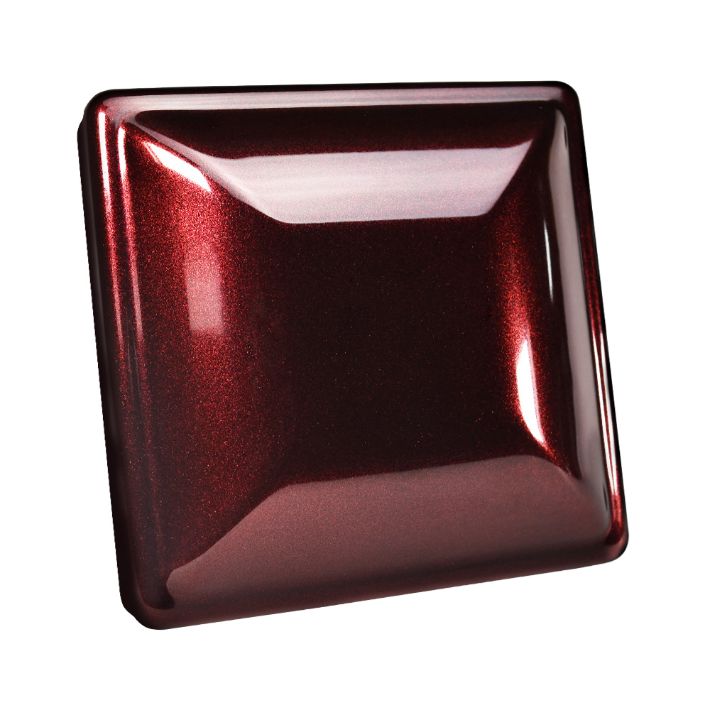 This is a dark, high gloss coating with a very heavy amount of fine, red metallic pearl flakes.