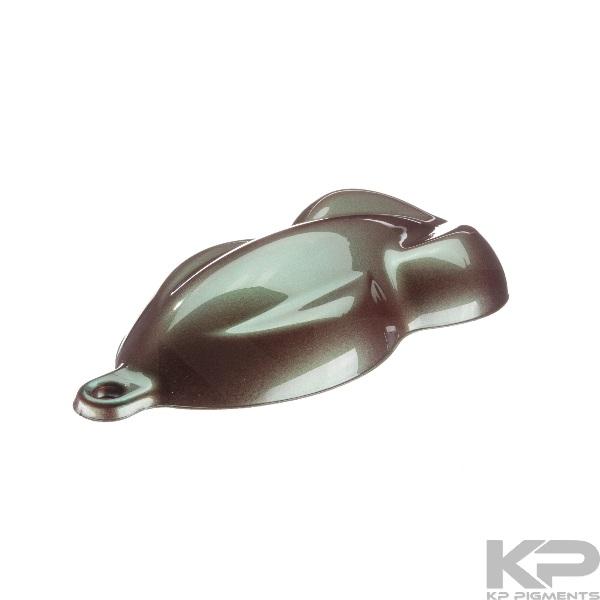 One of the most unique solid pearls we have. Grey downflops with green highlights and a subtle red in the shadows. Finishes to a smooth pearl sheen. Pictured over a black base coat. Use .25 – 3% Ratio of KP Pigment to Clear.