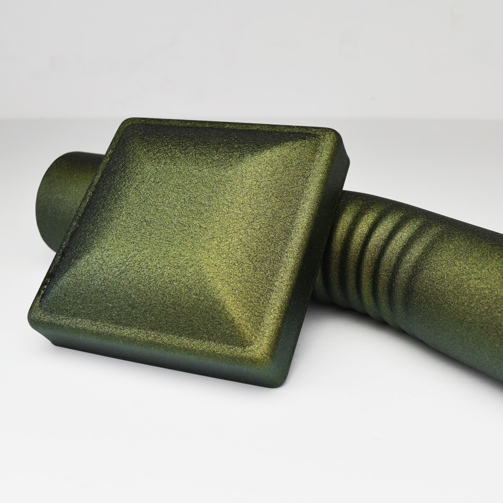 This is a dark wrinkle coating with very fine, color-shifting metallic flakes. These vibrant flakes change between yellow-brown, gold, green, and blue.