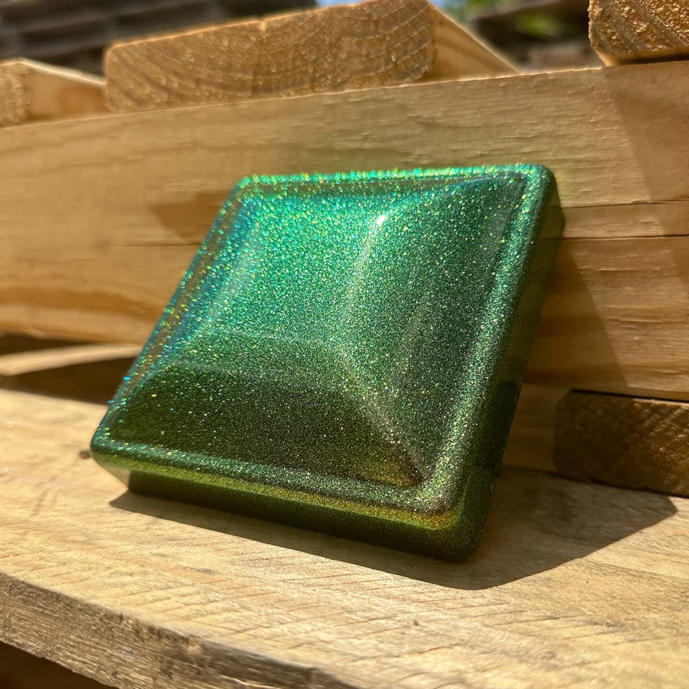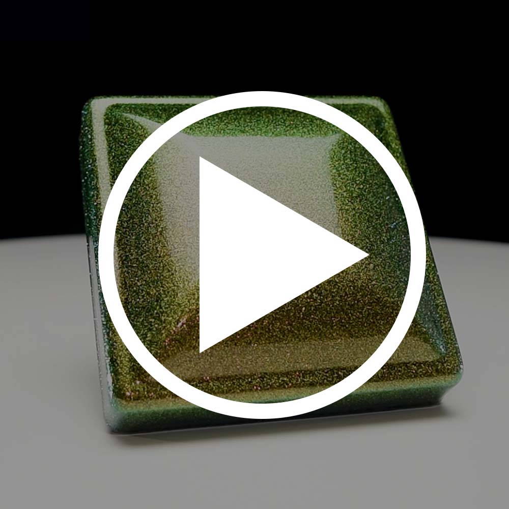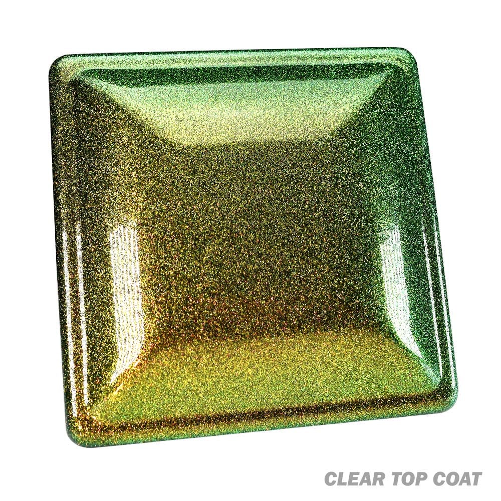This is a smooth, high gloss clear coat with a heavy amount of vibrant, color-shifting metallic flakes. These intense color shifting flakes change between blue, teal, light-green, green, and bronze-gold colors.