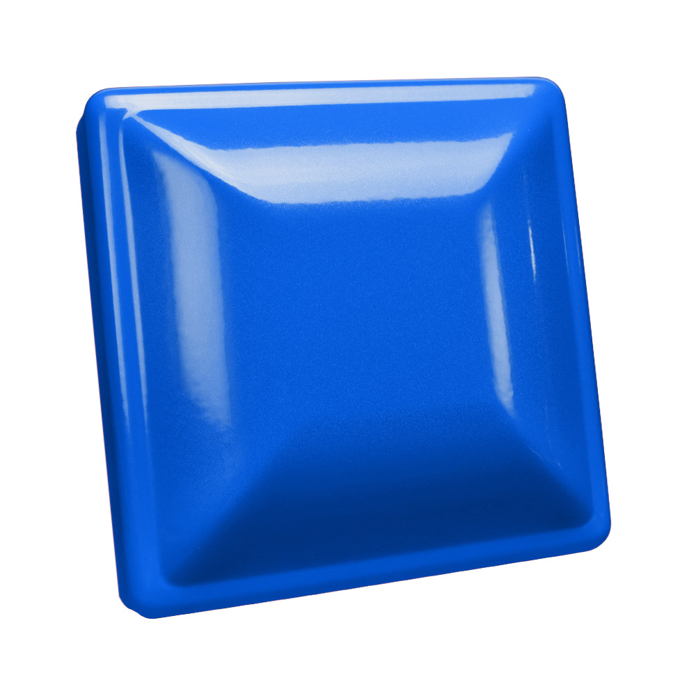 A high gloss blue coating with a smooth finish and contains a fine blue metallic flake (pearl-like).