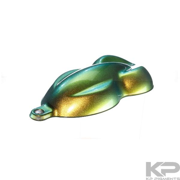 The most vivid and chromatic colorshift/ color travel pigments on the market. Unbelievable hiding ability and chroma; shifts between: Yellows to Golds to Greens to Blues. Finishes to a super fine pearlescent sheen. Pictured over a black base coat. Use .25 – 3% Ratio of KP Pigment to Clear.
