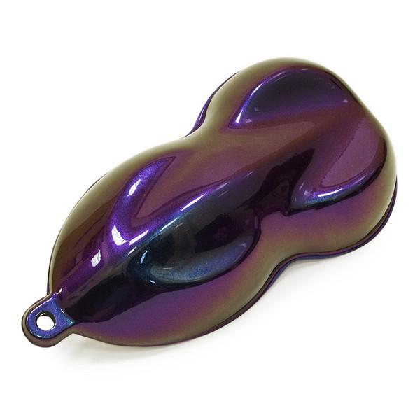The most vivid and chromatic colorshift/ color travel pigments on the market. Unbelievable hiding ability and chroma; shifts between: Greens to Blues to Magentas to Golds. Finishes to a pearlescent sheen. Pictured over a black base coat. Use .25 – 3% Ratio of KP Pigment to Clear.